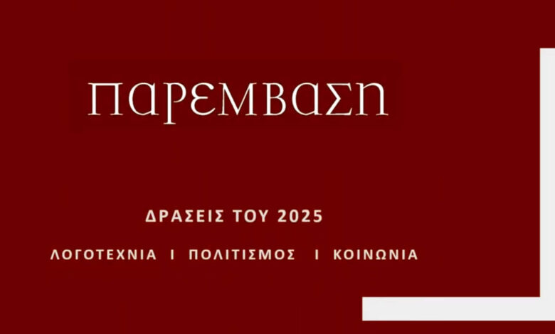 Το 2025 η Παρέμβαση συνέχισε τη δράση της με επίκεντρο τη λογοτεχνία και την πολιτιστική δημιουργία, σε σταθερή σύνδεση με την κοινωνία και την καθημερινή ζωή. Μέσα από δράσεις δημόσιου χαρακτήρα, θεματικές εκδηλώσεις, εκπαιδευτικές παρεμβάσεις και συνεργασίες, ο φορέας διατήρησε ενεργή παρουσία στον πολιτιστικό διάλογο, ενισχύοντας τη σχέση λογοτεχνίας, πολιτισμού, κοινωνίας και τόπου.