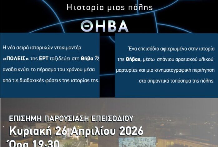 Η νέα σειρά ιστορικών ντοκιμαντέρ ΠΟΛΕΙΣ της ΕΡΤ ταξιδεύει στη Θήβα και αναδεικνύει το πέρασμα του χρόνου μέσα από τις διαδοχικές φάσεις της ιστορίας της.