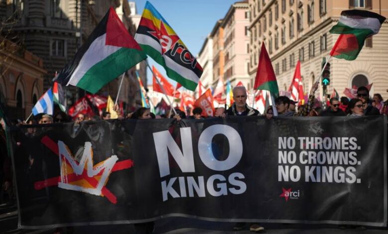 Πολίτες συμμετέχουν σε εθνική αντιπολεμική διαδήλωση που διοργάνωσε το κίνημα «No Kings Italy» στη Ρώμη, το Σάββατο 28 Μαρτίου 2026.
