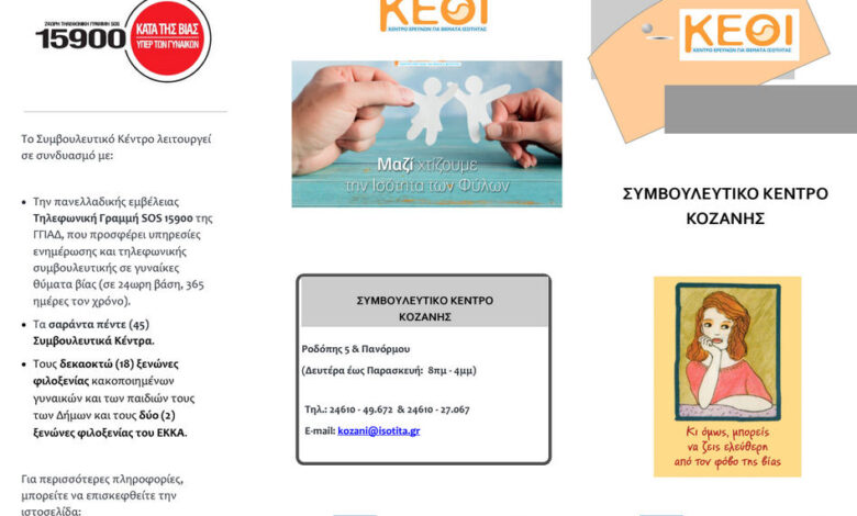 Σε τοπικό επίπεδο, το Συμβουλευτικό Κέντρο Κοζάνης του ΚΕΘΙ παρέχει δωρεάν υπηρεσίες κοινωνικής, ψυχολογικής, νομικής και εργασιακής στήριξης σε γυναίκες που έχουν υποστεί βία ή πολλαπλές μορφές διακρίσεων. Οι υπηρεσίες περιλαμβάνουν, μεταξύ άλλων, νομική υποστήριξη, σχεδιασμό πλάνου ασφάλειας, αξιολόγηση κινδύνου, καθώς και παραπομπή σε αρμόδιες αρχές και φορείς.