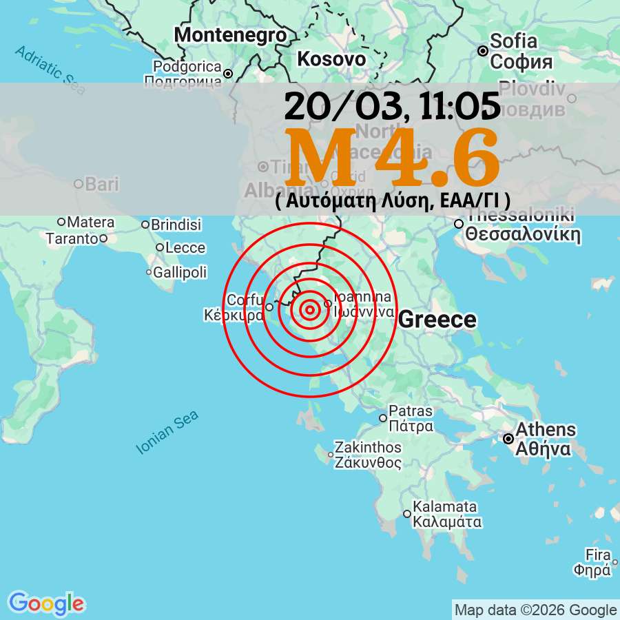 Σύμφωνα με τα πρώτα στοιχεία, ο σεισμός είχε μέγεθος 4,6 βαθμών της κλίμακας Ρίχτερ, με επίκεντρο να εντοπίζεται περίπου 27 χιλιόμετρα δυτικά των Ιωαννίνων, ενώ το εστιακό βάθος υπολογίζεται στα 5 χιλιόμετρα.