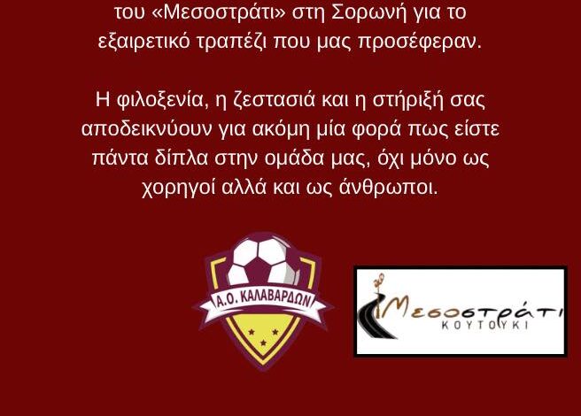 Ο Α.Ο. Καλαβαρδών μέσω ανακοίνωσης του ευχαριστεί τον Μηνά Κασέρη και το “Μεσοστράτι” για το εξαιρετικό τραπέζι που του πρόσφεραν.