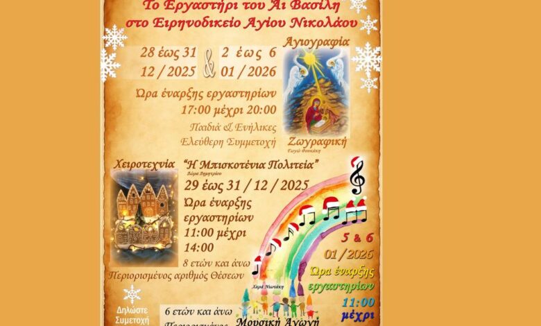 Το αληθινό παραμύθι των Χριστουγέννων συνεχίζεται την εορταστική περίοδο στο «Εργαστήρι του Αι Βασίλη» που θα φιλοξενηθεί στο κτίριο του «Ειρηνοδικείου» Αγίου Νικολάου.