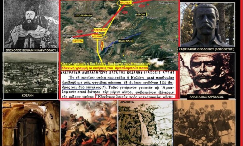 Όταν μια ομάδα μαχητών από τη Νάουσα δραπέτευσε και έφτασε στην Κοζάνη, η πόλη τους βοήθησε, αλλά αυτό έγινε γνωστό στον Διοικητή της Θεσσαλονίκης, Αμπαλαμπούτ πασά, ο οποίος πολιόρκησε τη Νάουσα μπήκε μέσα και στο τέλος την κατέστρεψε, και ξεκίνησε για την Κοζάνη με σκοπό να την ισοπεδώσει .