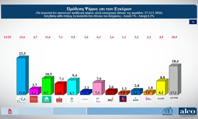 Στο 23,5% διαμορφώνεται το ποσοστό που συγκεντρώνει η Νέα Δημοκρατία στην πρόθεση ψήφου επί των εγκύρων στη δημοσκόπηση της Alco για λογαριασμό του Alpha.