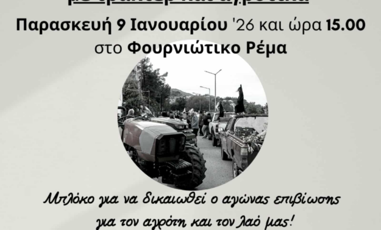Σε νέα κινητοποίηση προχωρούν οι αγρότες της Σάμου την Παρασκευή 9 Ιανουαρίου στήνοντας μπλόκο στις 3 το μεσημέρι στο Φουρνιώτικο Ρέμα στο Καρλόβασι.