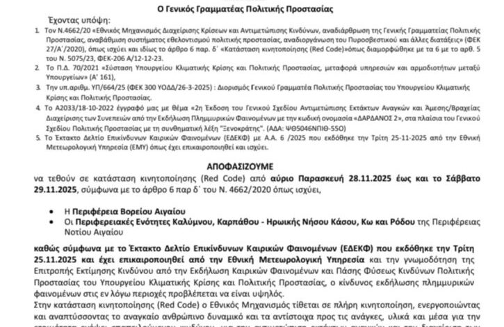 Η Γενική Γραμματεία Πολιτικής Προστασίας εξέδωσε σήμερα κατάσταση ετοιμότητας «RED CODE» για την Περιφέρεια Βορείου Αιγαίου και τα Δωδεκάνησα.