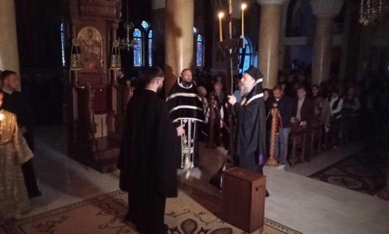Σε ατμόσφαιρα βαθιάς κατάνυξης τελέστηκε η Ακολουθία των Αχράντων Παθών τη Μεγάλη Πέμπτη στον Ιερό Ναό Άγιου Κωνσταντίνου και Ελένη, συγκεντρώνοντας πλήθος πιστών από την ευρύτερη περιοχή των Τρικάλων.