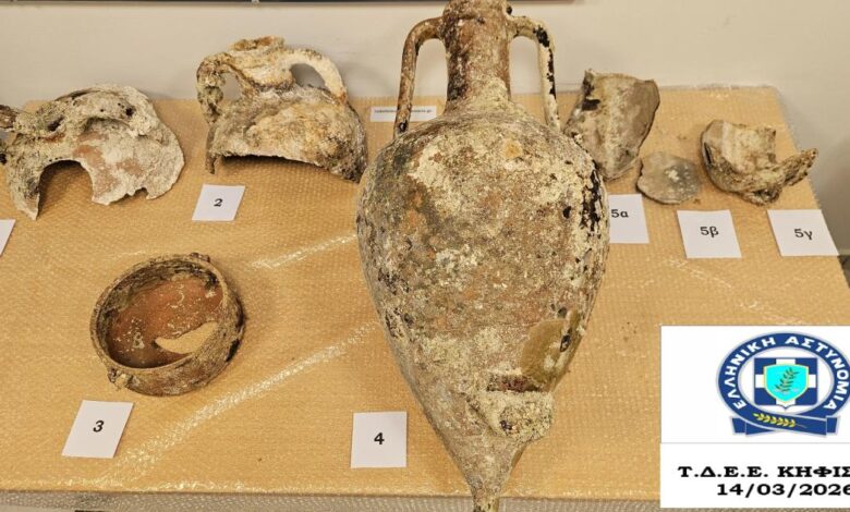 Ένας 50χρονος συνελήφθη στην Κηφισιά μετά τον εντοπισμό 10 τμημάτων ενάλιων αμφορέων στο σπίτι του. Τα αντικείμενα καλύπτουν περιόδους από την ελληνιστική έως τη νεότερη εποχή και εξετάζονται από τις αρχές ως προστατευόμενα σύμφωνα με τον Νόμο περί Προστασίας Αρχαιοτήτων