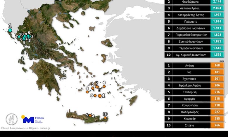 Όσον αφορά στις βροχοπτώσεις, σύμφωνα με τον κ. Λαγουβάρδο, τα μεγαλύτερα ύψη βροχής καταγράφηκαν στο Ιόνιο και στην Ήπειρο, ενώ τα χαμηλότερα στις Κυκλάδες.