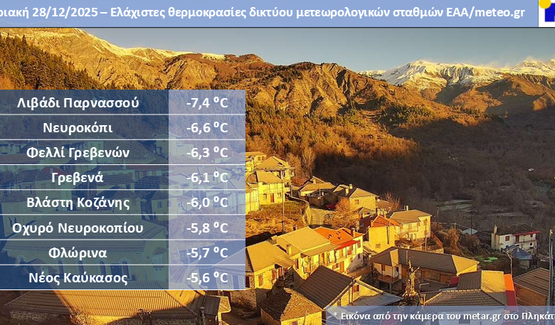 Ισχυρός παγετός σημειώθηκε τις πρωινές ώρες της Κυριακής 28/12, κυρίως στα κεντρικά και βόρεια ηπειρωτικά τμήματα, με τη χαμηλότερη ελάχιστη θερμοκρασία να καταγράφεται στο Λιβάδι Παρνασσού με -7,4 °C, σύμφωνα με το meteo.gr.