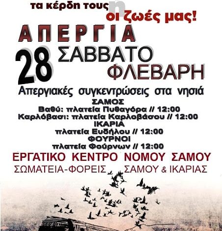 Συγκεκριμένα, μετά την προκήρυξη της 24ωρης απεργίας το Ε.Κ.Σ καλεί τους κατοίκους του Νομού να παρευρεθούν στις συγκεντρώσεις που έχουν προγραμματιστεί στις 12 το μεσημέρι, στην Πλατεία Πυθαγόρα στην πόλη της Σάμου, στην Πλατεία Βαλσκατζή στο Καρλόβασι και στην Πλατεία Φούρνων.