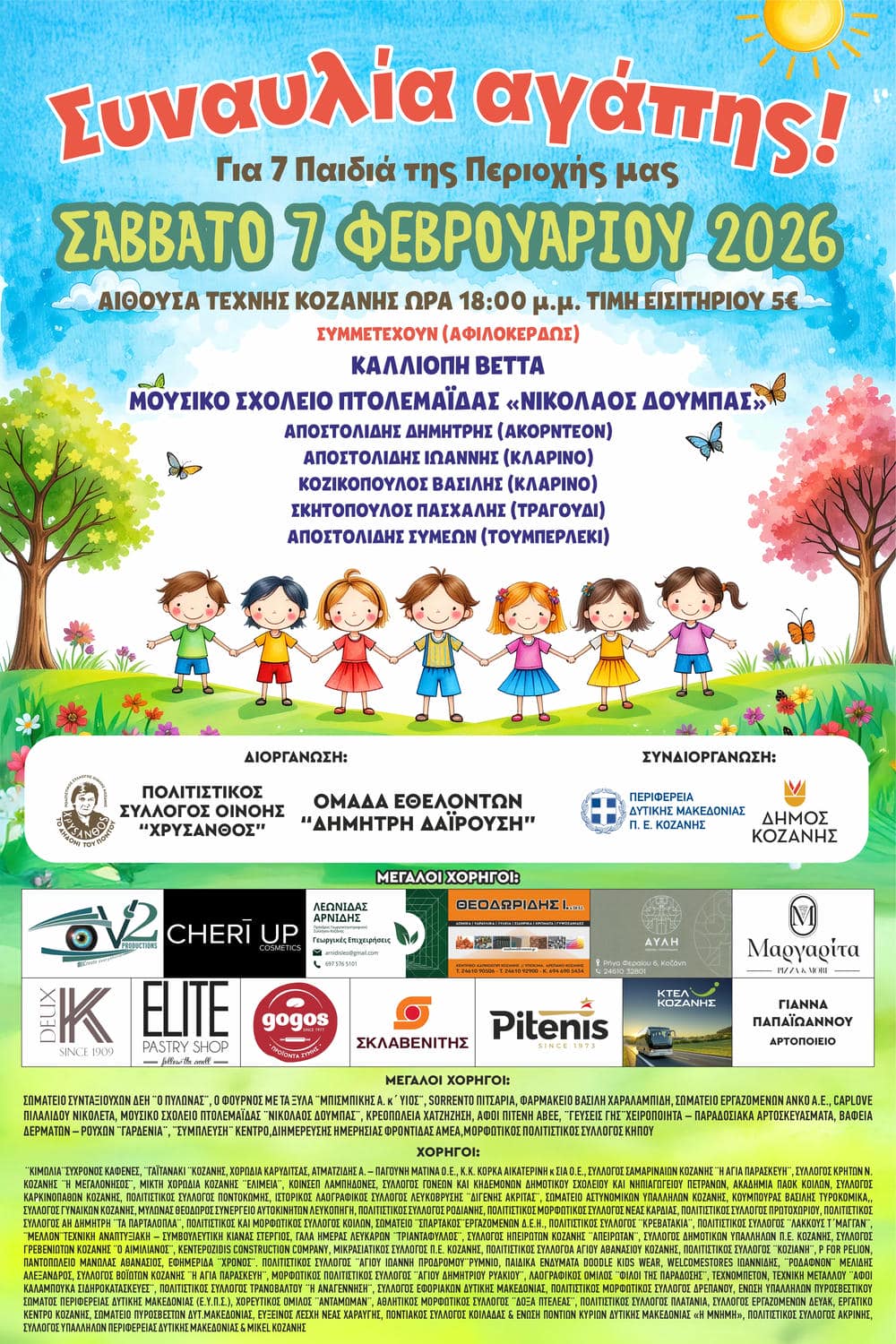 Η εκδήλωση θα πραγματοποιηθεί το Σάββατο 7 Φεβρουαρίου 2026 στην Αίθουσα Τέχνης του Δήμου Κοζάνης στις 18.00 μμ και ΟΛΑ τα έσοδα θα διατεθούν σε επτά (7) παιδιά με πολύ σοβαρά προβλήματα υγείας.