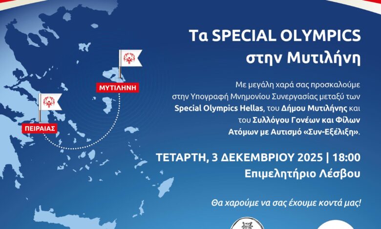 Την Τετάρτη 3 Δεκεμβρίου, θα υπογραφεί στο Επιμελητήριο Λέσβου στις 6:00 το απόγευμα , μνημόνιο συνεργασίας με στόχο τη δημιουργία νέων ευκαιριών συμμετοχής στον αθλητισμό για τα άτομα με νοητική αναπηρία στο νησί της Λέσβου. Οι μελλοντικοί αθλητές των Special Olympics θα ξεκινήσουν προπονήσεις στο άθλημα της καλαθοσφαίρισης, με προοπτική να προστεθούν σύντομα και άλλα αθλήματα.