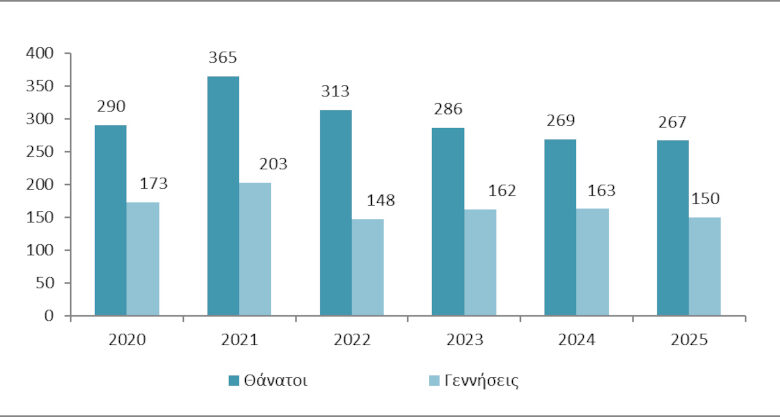| Ποσοστό γεννήσεων επί των θανάτων | 59,7% | 55,6% | 47,3% | 56,6% | 60,6% | 56,2% | 55,8% |